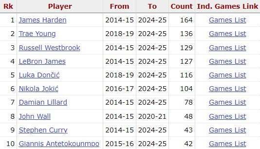 2025-03-10 15:27:57哈登過去10年里165場比賽至少25分10助 同期所有球員中最多
