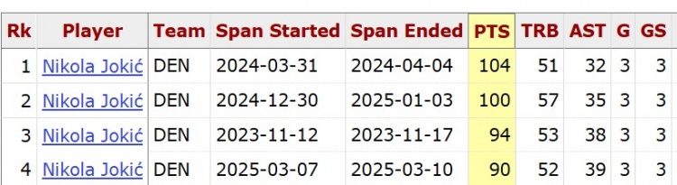 據(jù)統(tǒng)計(jì),約基奇在連續(xù)3場(chǎng)比賽中至少得到90分50籃板30助攻,自聯(lián)盟合并以來(lái)唯一,而且他生涯已經(jīng)是第4次做到這一點(diǎn)。