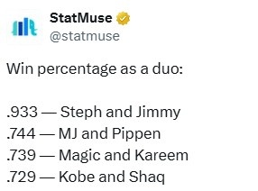 2025-03-16 13:17:36庫里+巴特勒勝率93.3%!美媒對比:喬丹皮蓬74.4% 科比鯊魚72.9%
