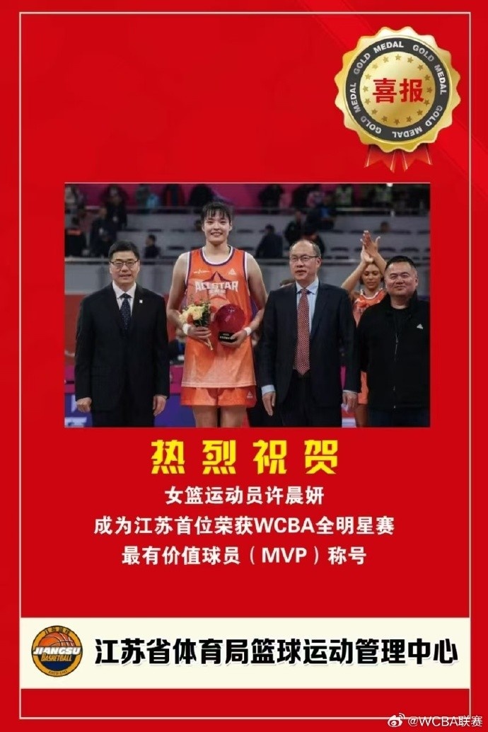 2025-02-25 00:15:42江蘇省體育局籃球中心發來賀電 祝許晨妍成江蘇首位女籃全明星MVP