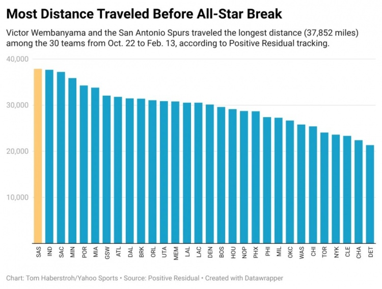 全明星前旅行最遠距離:根據Positive Residual的追蹤,文班亞馬和馬刺從10月22日到2月13日之間,旅行的總距離(37,852英里)在30支球隊中排名第一。