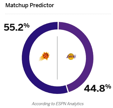 2025-03-16 21:45:58老詹缺陣&77大概率打!ESPN預測湖vs日勝率:湖人44.8% 太陽55.2%