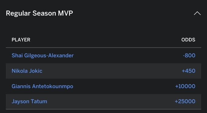 2025-03-16 21:58:50大局已定?今日比賽結束后 MVP賠率SGA-800斷層領先 約基奇+450
