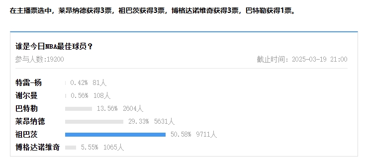 在主播票選中,萊昂納德獲得3票,祖巴茨獲得3票,博格達(dá)諾維奇獲得3票,巴特勒獲得1票。