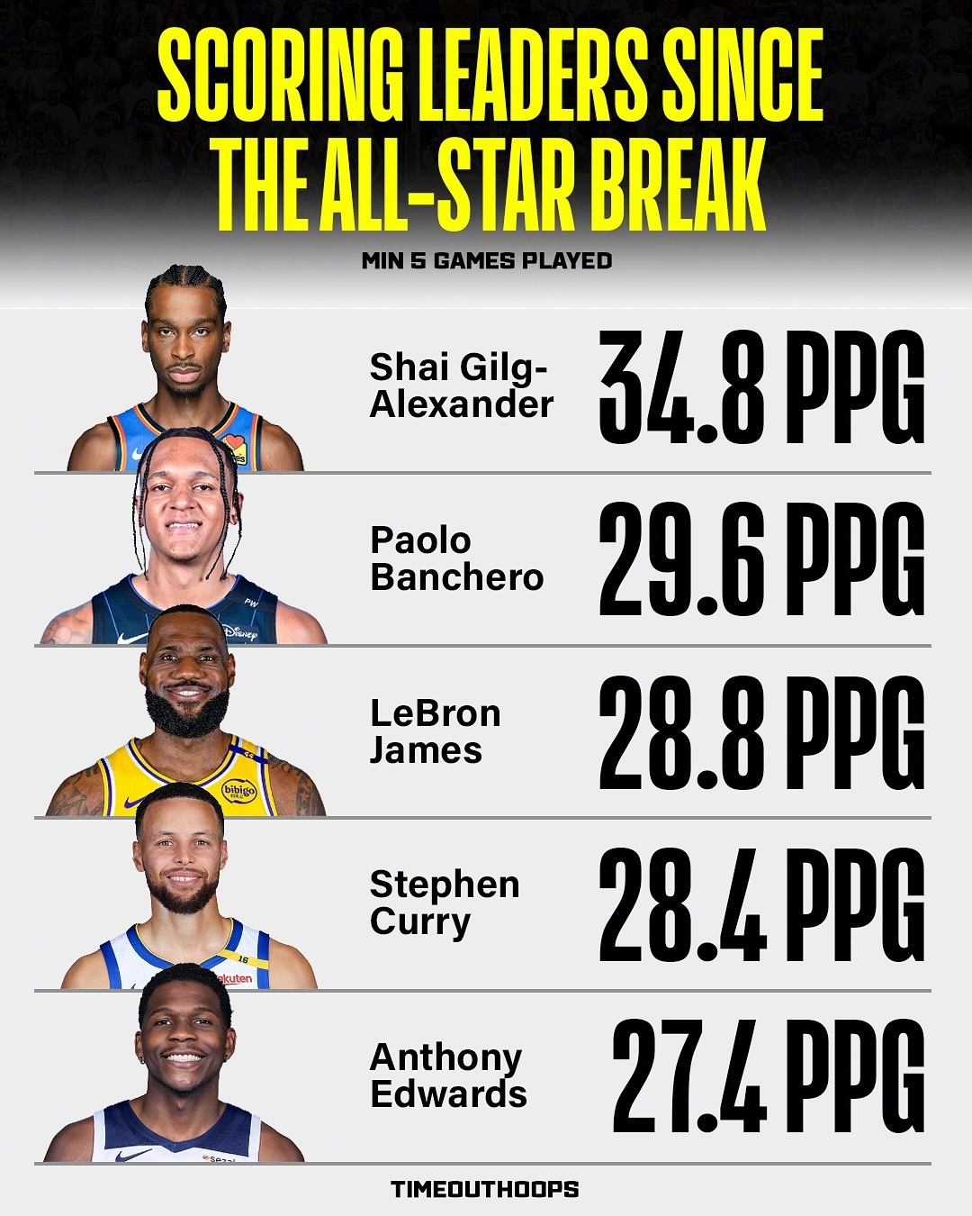 2025-03-19 21:48:46全明星后得分榜:鴨梨34.8分斷檔第一 班凱羅第二 詹庫分列三四位