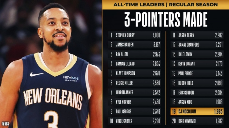 2025-03-20 11:22:57生涯能到多少?CJ三分命中數(shù)1983 超越諾維茨基升至歷史第19