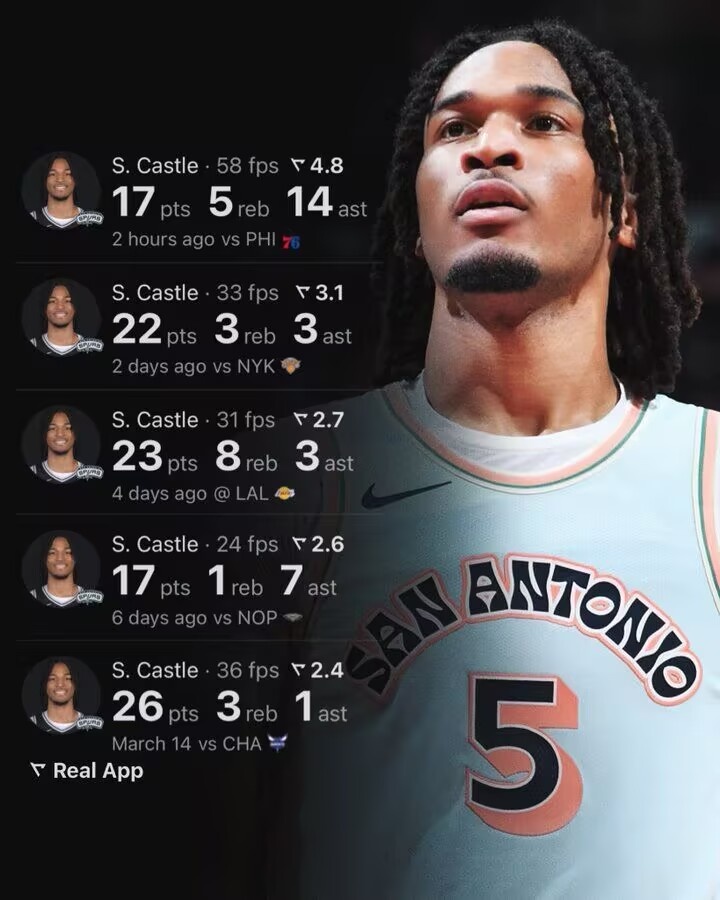 2025-03-22 21:20:53最佳新秀穩了?卡斯爾過去5場場均21分4板5.6助 真實命中率56%