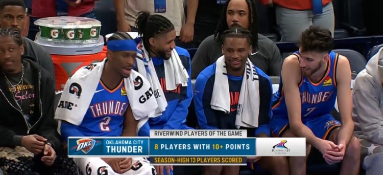 本場比賽雷霆全員發揮,全隊共有13個人有得分入賬,創本賽季新高,其中更是有8人得分上雙!