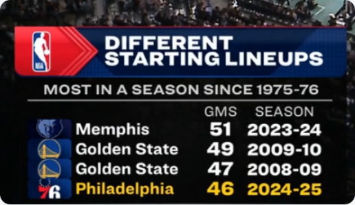 2025-03-22 21:36:25傷兵滿營(yíng)!76人本賽季70場(chǎng)比賽排出46套首發(fā) 49年來(lái)歷史第四多