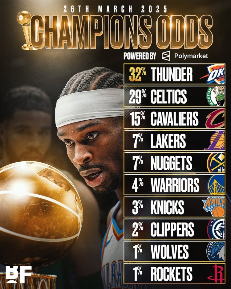 2025-03-27 21:20:26賽季奪冠概率:雷霆第一壓綠軍 湖人掘金7% 勇士4% 快船2%