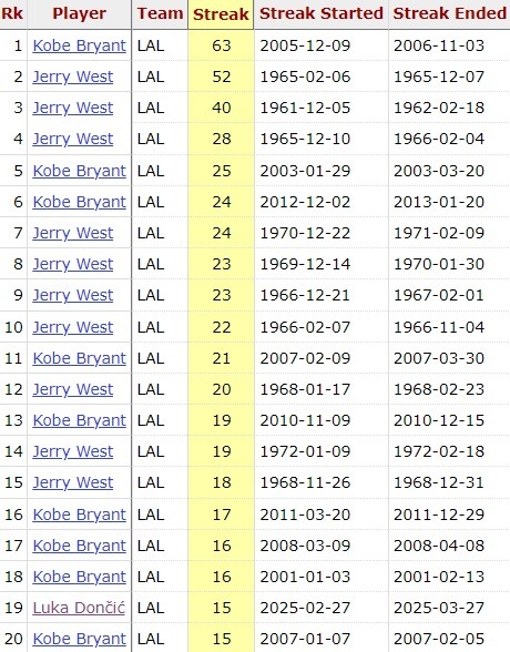 2025-03-30 13:36:12東契奇連續15場20+ 湖人隊史后衛第3人 比肩科比和韋斯特