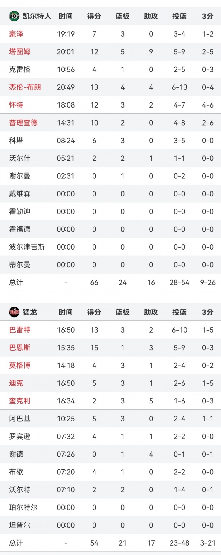 2025-02-26 10:06:33凱爾特人半場66-54領先猛龍12分 全隊4人得分上雙
