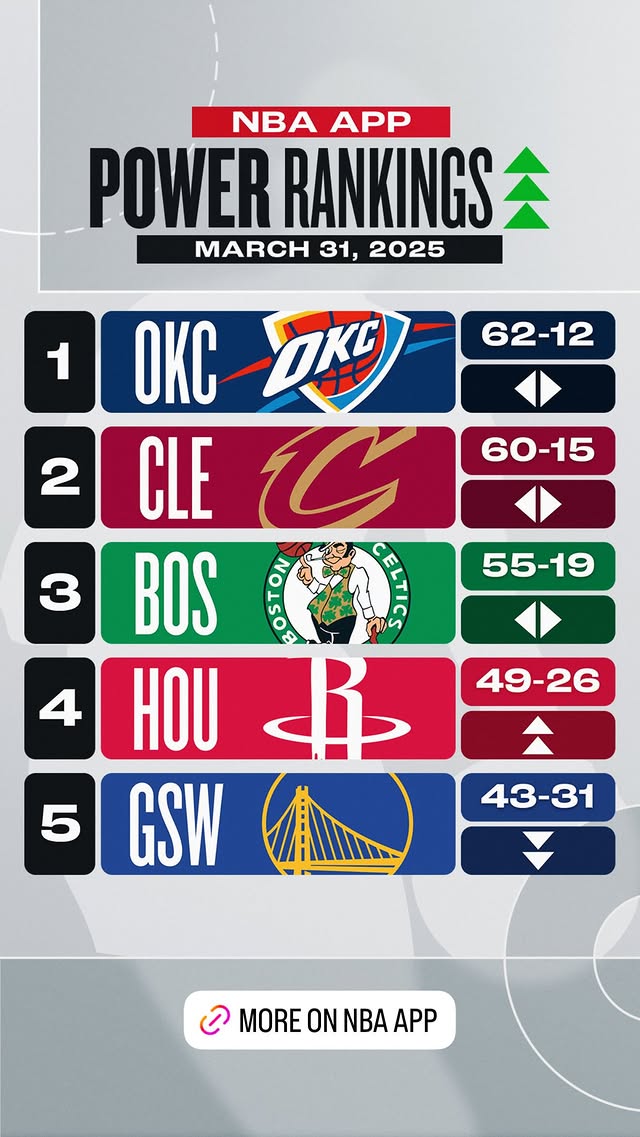 2025-04-01 14:21:50戰力榜:火箭狂飆4位升至前四!勇士下降1位排名第5&湖人跌出前五