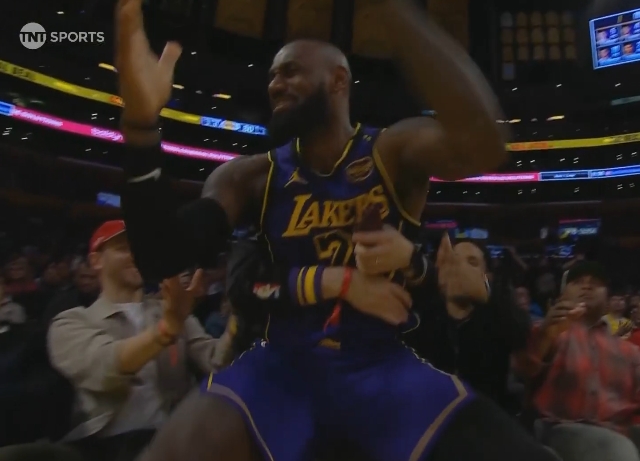 2025-02-26 15:14:00詹姆斯快攻上籃飛出場外摔到場外觀眾席 裁判未響哨&老詹十分不滿