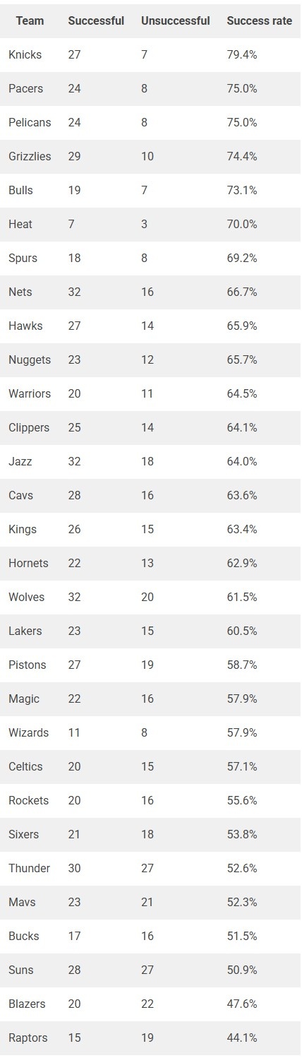 然而,挑戰的成功率并不是唯一衡量標準。一些教練雖然成功率較低,但成功推翻的判罰次數更多。這些成功次數多的教練包括籃網主教練費爾南德斯、爵士主教練威爾-哈迪和森林狼主教練克里斯-芬奇,他們三人以成功推翻32次判罰并列聯盟第一。