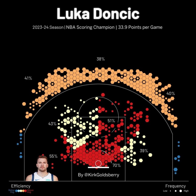 當你繪制出東契奇最常見的投籃位置時,有兩個熱點:一個在籃筐附近,另一個是在三分線外左側45度處。這個外線熱點正是東契奇在周日的比賽中讓布勞恩上當的地方——這也是東契奇最喜歡的起舞的位置。