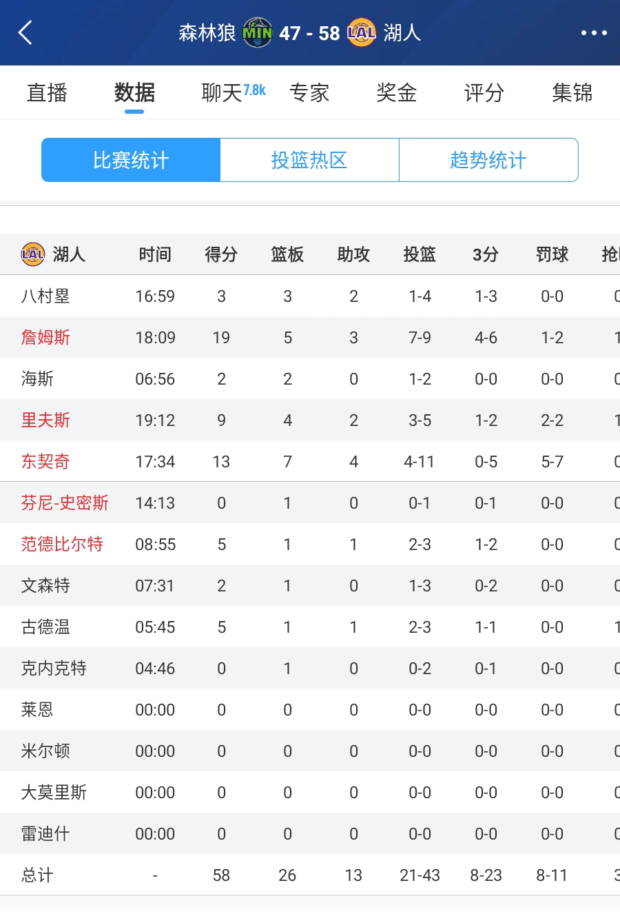 2025-02-28 15:18:30詹姆斯9中7高效19分5板3助 東契奇已筑三雙雛形 湖人半場領先11分