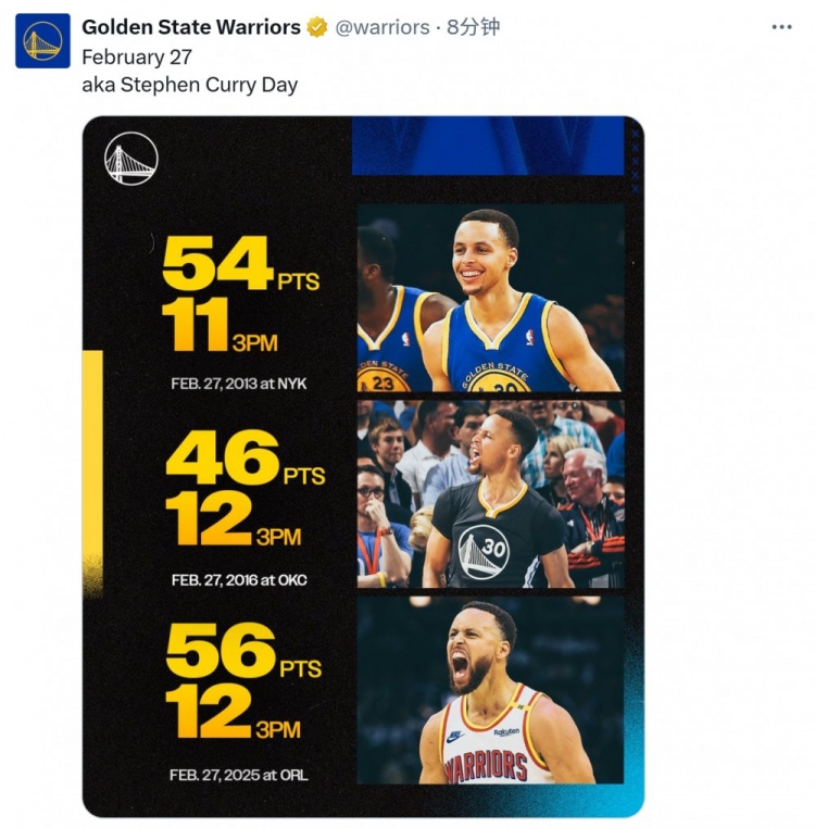 2025-02-28 15:20:1413年&16年的今天也有神級表現!勇士官推:2月28日亦稱“庫里日”
