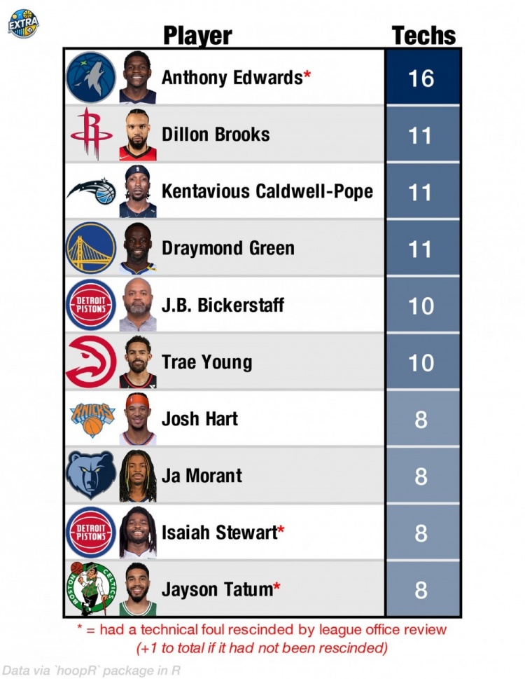 2025-03-01 10:11:48華子16次遭停賽!本賽季技犯榜:狄龍&追夢11次第二 活塞主帥10次
