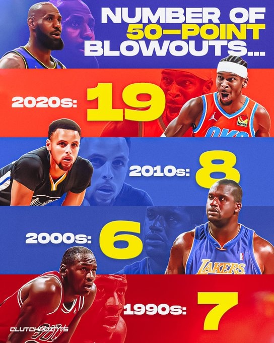 2025-03-02 11:00:20常規賽分差50+場次:2020年至今19次 20年之前30年21次