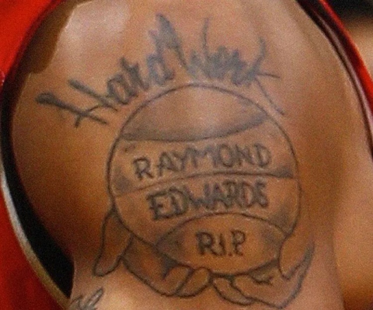 “如果我不打籃球的話,舅舅不會(huì)開心的。同時(shí),我要承擔(dān)起責(zé)任,成為一家之主。”他在肩膀上文了一個(gè)文身,在一雙祈禱的手上,刻著“努力工作”這幾個(gè)字,雙手握著一個(gè)籃球,籃球上寫著,“雷蒙德-愛德華茲,RIP”,努力工作、祈禱和籃球,這是他和舅舅之間,最牢不可破的紐帶。