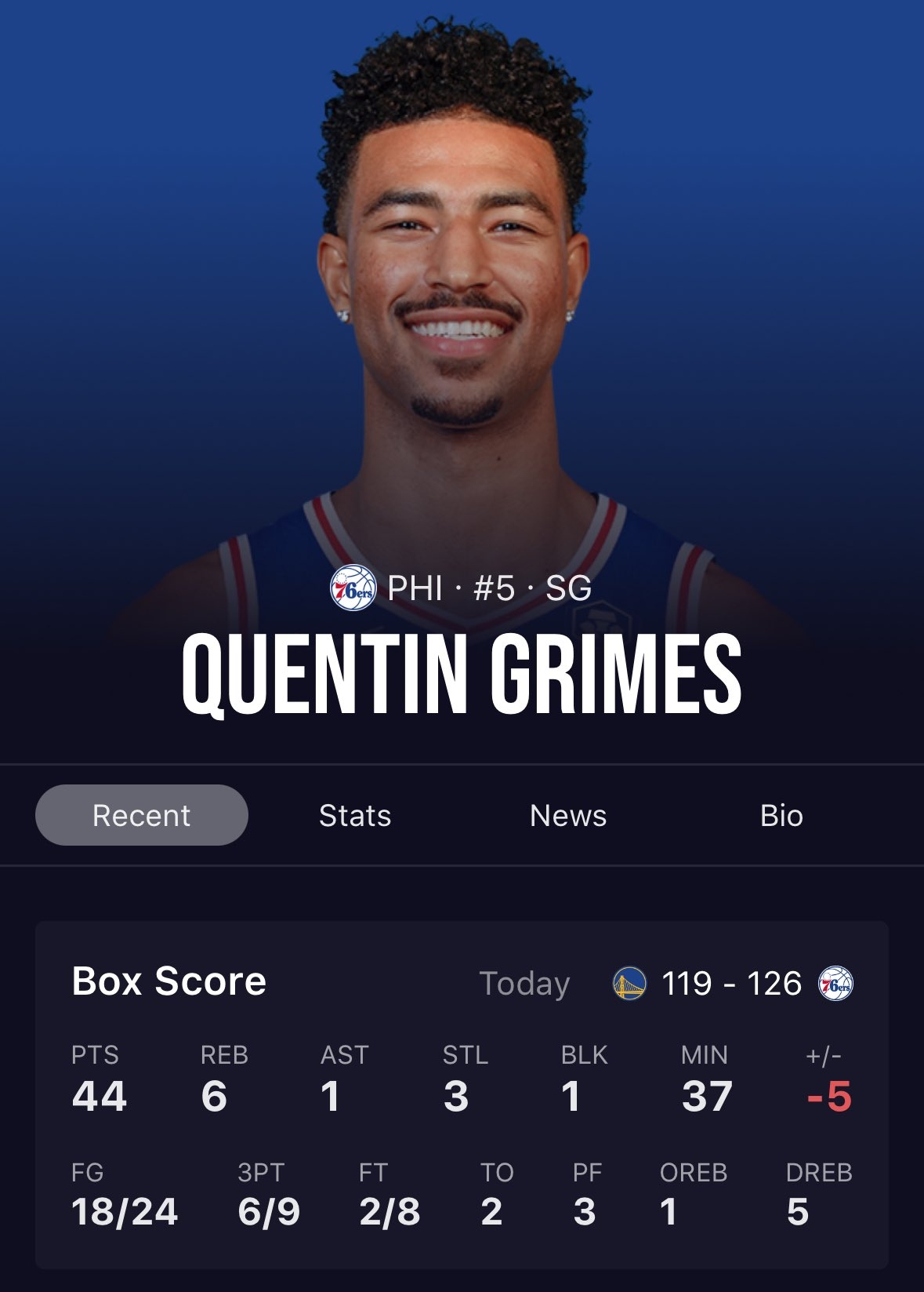 此役,76人后衛、獨行俠舊將格萊姆斯表現神勇,他上場36分43秒24投18中,三分9中6、罰球8中2,砍下44分創生涯新高,還有6籃板1助攻3搶斷1封蓋進賬。
