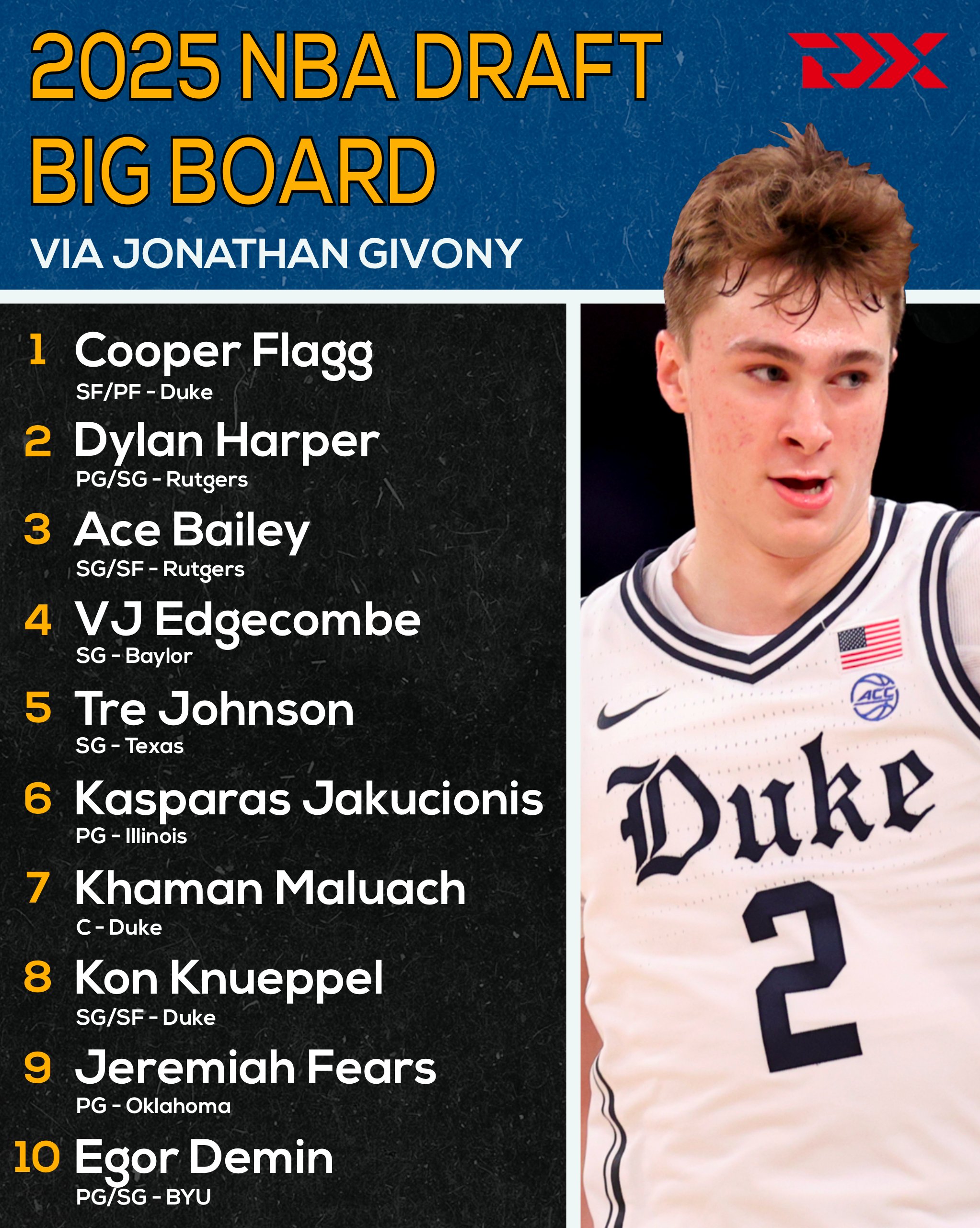 ESPN本次榜單前四位與TA榜單完全一致,杜克大學新星庫珀-弗拉格穩居首位,羅格斯大學雙子星迪倫-哈珀和埃斯-貝利分列二三,第四位是來自巴哈馬的新人后衛埃奇庫姆。