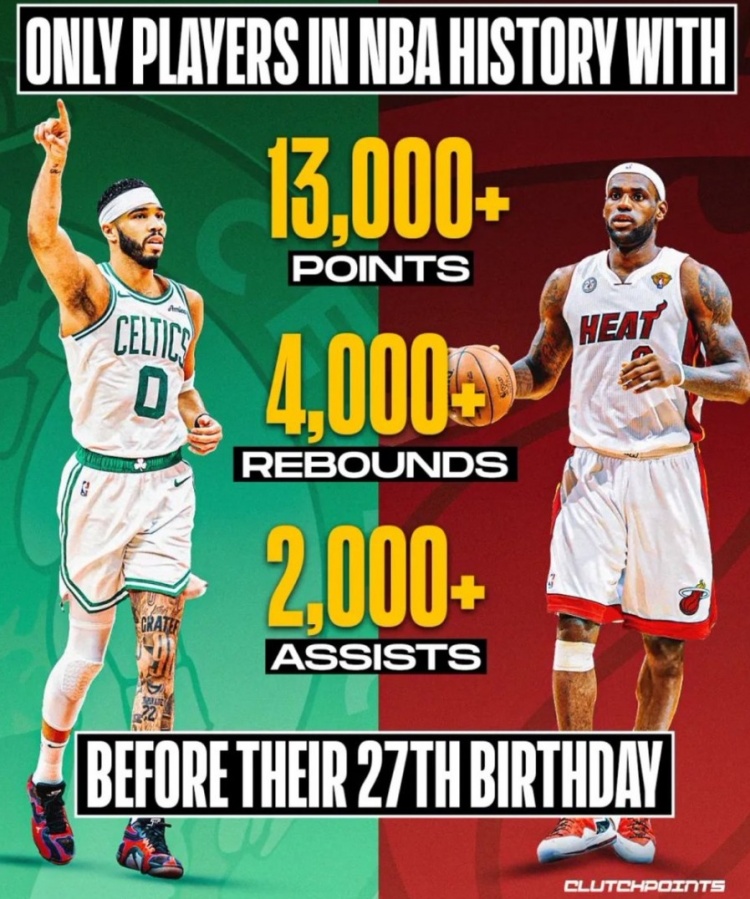 2025-03-04 14:06:19塔圖姆27歲前至少13000分4000板2000助 歷史唯二&比肩詹姆斯
