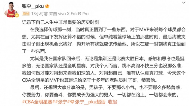 全明星正賽南北區(qū)對(duì)決時(shí),北區(qū)明星隊(duì)最終以159比136戰(zhàn)勝南區(qū)明星隊(duì),北區(qū)中鋒鄒雨宸砍下23分,獲得全明星賽MVP。值得一提的是,張寧在比賽末節(jié)時(shí)刻面對(duì)夾擊,并沒(méi)有選擇“單打刷分”,而是傳球給了鄒雨宸,助力鄒雨宸完成暴扣,進(jìn)而拿下MVP。