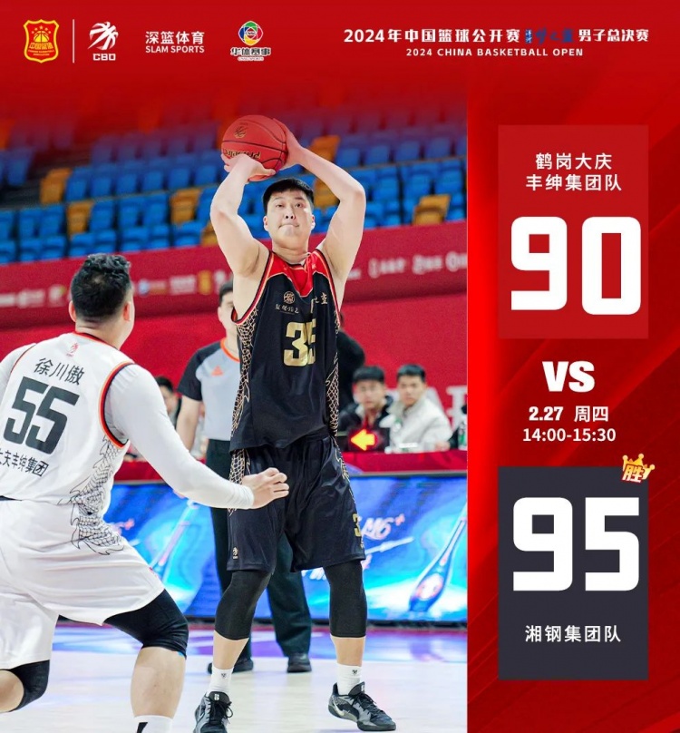 比賽開始,兩隊上來比較慢熱。隨后大慶豐紳集團積極拼搶前后場籃板,牢牢把握籃下優勢,率先取得領先。湘鋼集團組織快攻,同時在外線穩定輸出,緊咬比分。半場結束,大慶豐紳集團48-46領先湘鋼集團。下半場,兩隊打得依舊膠著。末節90平后,湘鋼集團26號陳雙三分命中,2號達斯坦·哈爾恒搶斷后上籃得分,幫助湘鋼集團95-90戰勝大慶豐紳集團。