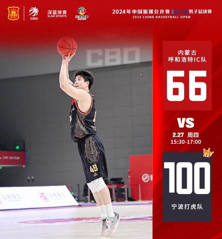 上半場,寧波打虎一開場就展現了超強的得分能力,以16-5領先。內蒙古IC通過外線連續三分,不斷追分。但在快攻的情況下,內蒙古IC失誤增多,且命中率下降。半場結束,寧波打虎50-26領先內蒙古IC。下半場,兩隊之間的實力差距愈發明顯,寧波打虎最終以100-66戰勝內蒙古IC。