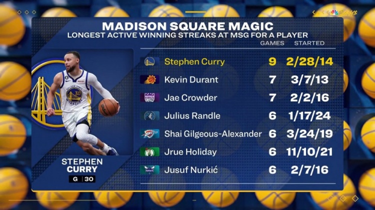 2025-03-05 08:37:17現(xiàn)役球員在尼克斯主場連勝榜:庫里9連勝第1 杜蘭特7場并列第2