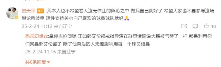 之后,賀天舉還在這條動態的評論區寫道:“我本人也不希望卷入這無休止的輿論之中 做我自己就好了 希望大家也不要參與這場輿論風波里 理性支持關心自己喜歡的球員球隊就好????”