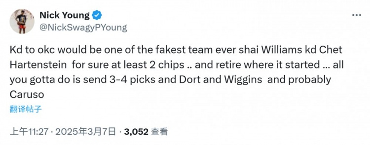 2025-03-07 16:51:00尼克-楊:杜蘭特若回雷霆至少能拿兩冠 還能在夢開始的地方退役