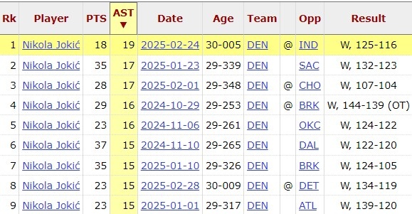 2025-03-08 17:49:28約基奇本賽季第10場比賽送出15+助攻 10戰全勝