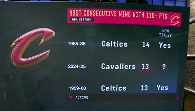 2025-03-08 17:56:52騎士成歷史第3支至少13連勝且得分皆110+球隊(duì) 此前綠軍2次都奪冠