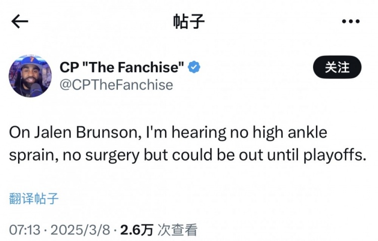 2025-03-08 18:12:29尼克斯博主:我聽說布倫森無需接受手術(shù) 但可能要缺席至季后賽前