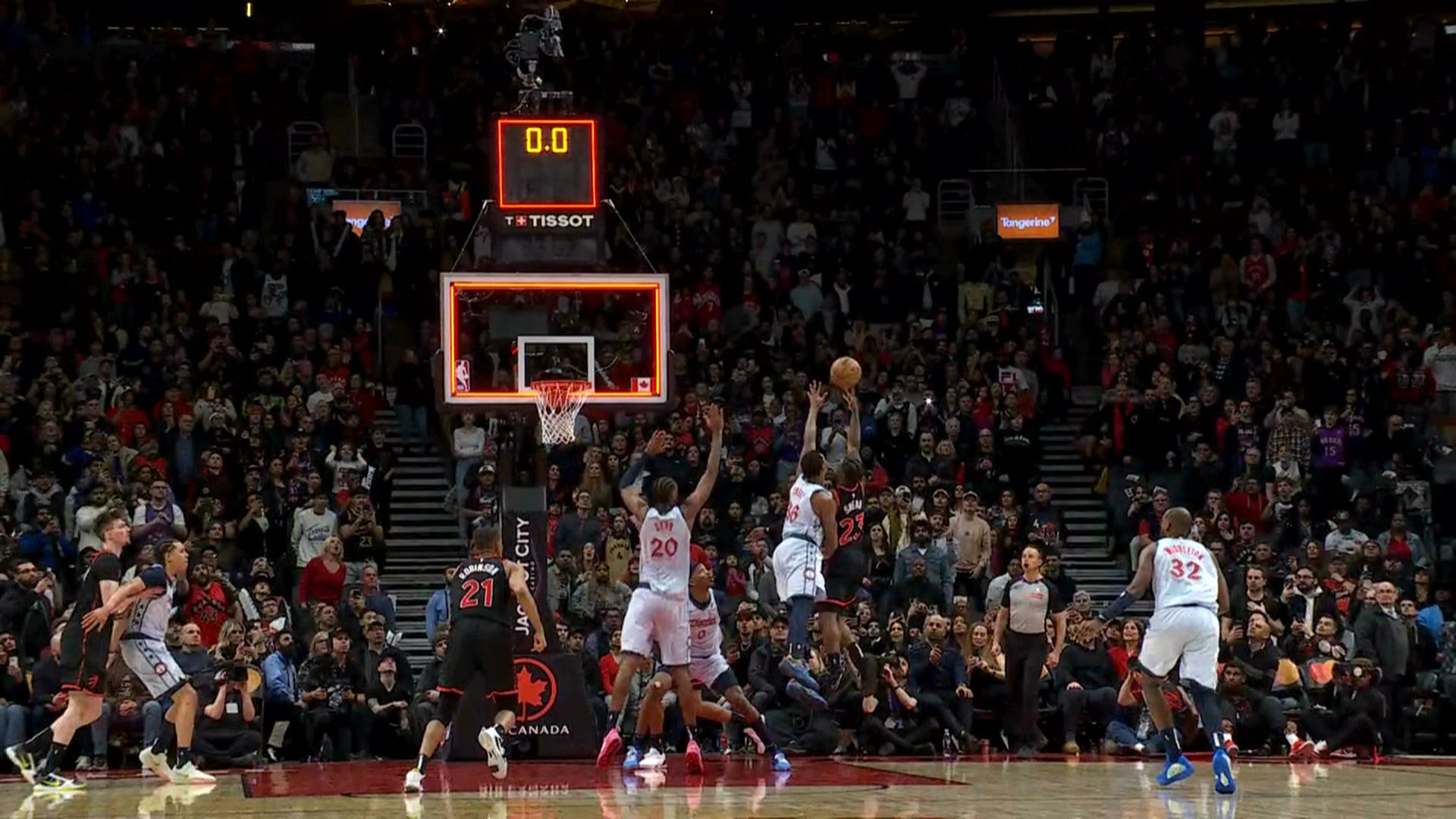 比賽最后2.3秒,賈馬爾-謝德絕殺上籃打板命中,猛龍球員和主場觀眾瘋狂慶祝,甚至已經有人帶著勝利的喜悅退場。但裁判查看回放后,確認進球超時,奇才死里逃生贏下比賽。