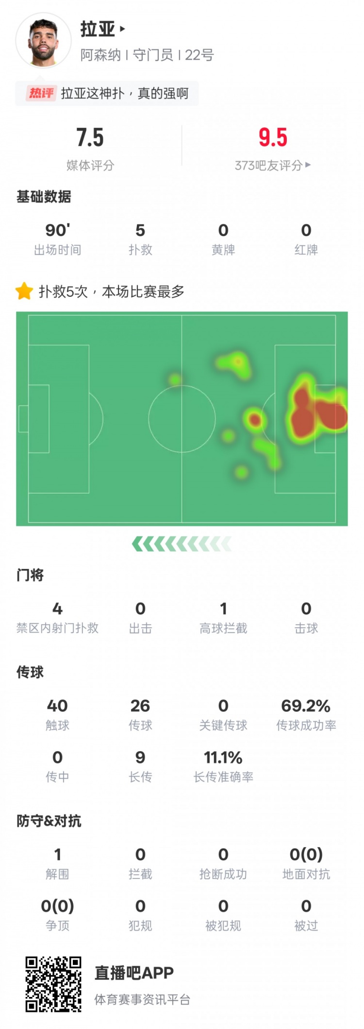 2025-03-10 03:15:46拉亞本場數據:5次撲救全場最多&4次撲救對手禁區內射門,評分7.5