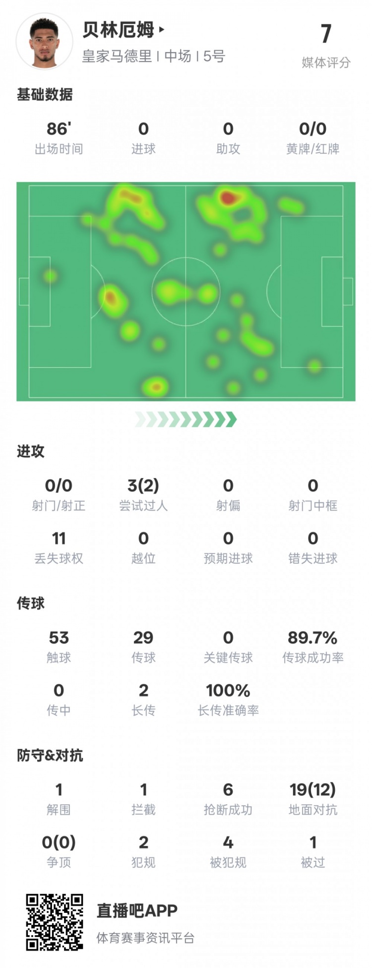 2025-03-10 03:17:17貝林厄姆本場數據:12次地面對抗成功2過人成功6搶斷,評分7.0
