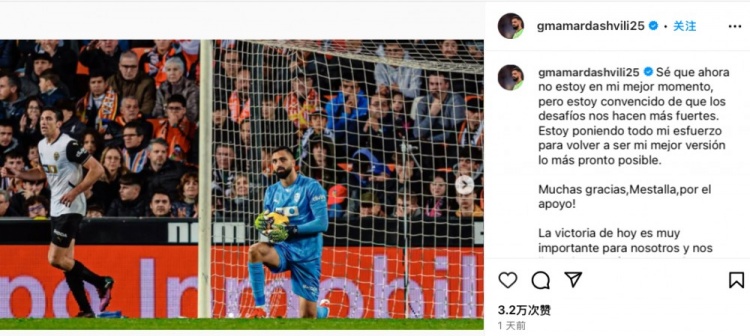 2025-03-10 20:01:43出球被斷,瑪瑪達什維利社媒致歉:困難讓人變強,會拿出最佳水平