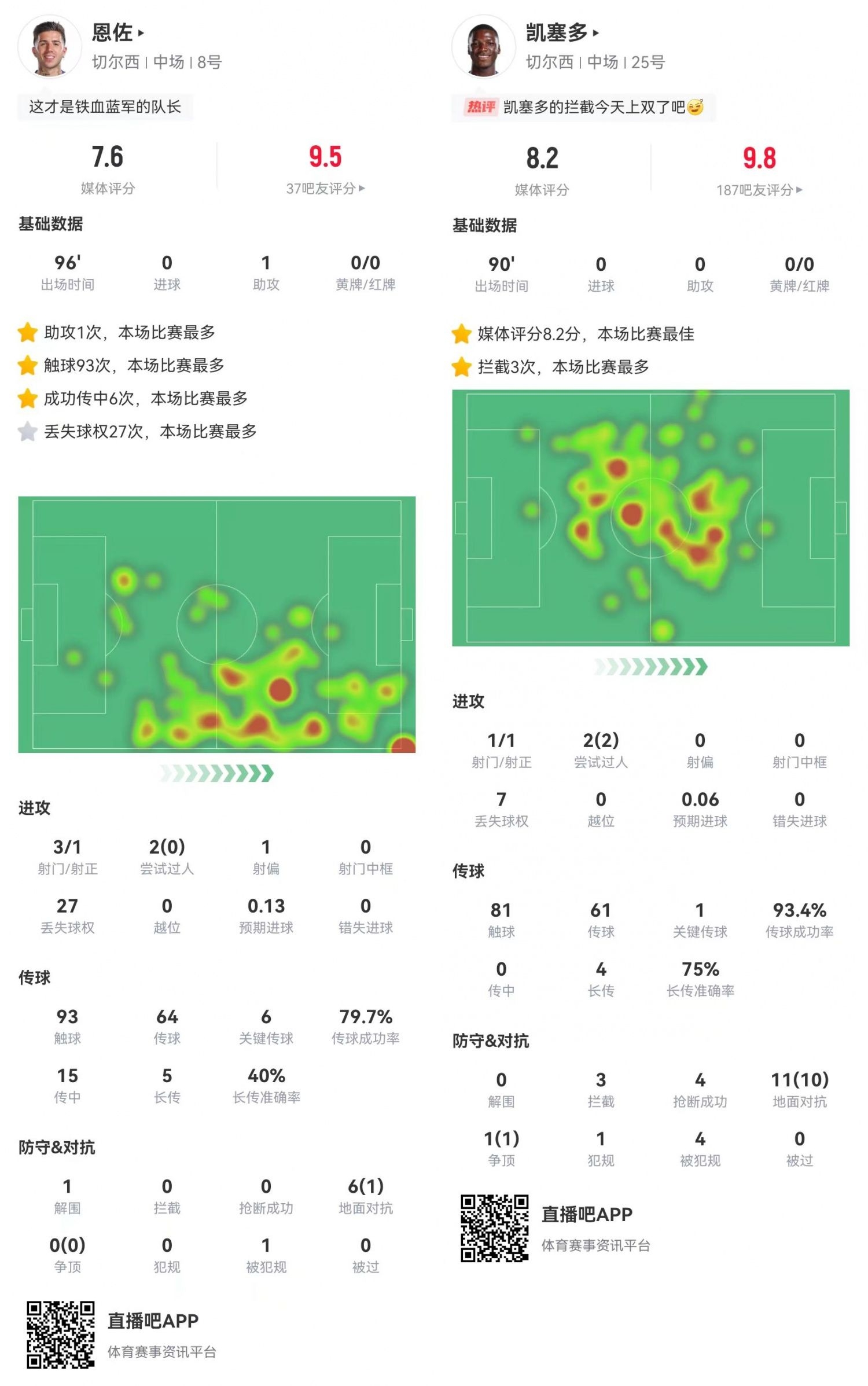 本場(chǎng)比賽恩佐與凱塞多的發(fā)揮可圈可點(diǎn)。“嘗試助攻王”恩佐總算“撿”到一個(gè)助攻,庫(kù)庫(kù)雷利亞的制勝球便是由恩佐傳導(dǎo)。凱塞多則繼續(xù)自己的戰(zhàn)神級(jí)發(fā)揮,本場(chǎng)比賽貢獻(xiàn)12次對(duì)抗11次成功,還有3攔截4搶斷0被過(guò)的鐵閘表現(xiàn)。切爾西的雙腰進(jìn)可攻退可守,正是藍(lán)軍本賽季戰(zhàn)績(jī)不錯(cuò)的原因之一。