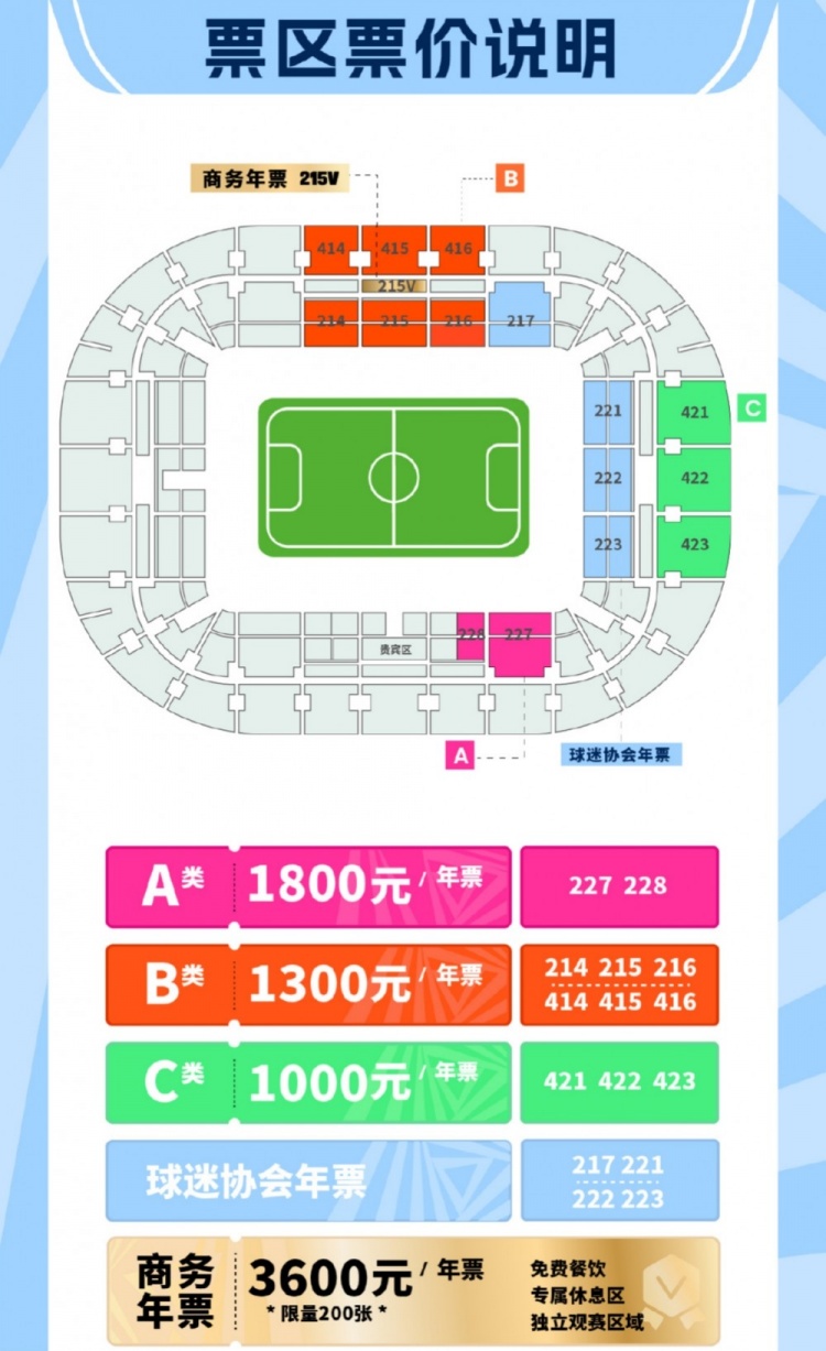 本次年票銷售,分為商務年票和看臺年票,其中商務年票的價格為3600元,限量200張;看臺年票共分為三檔,價格分別為1000元、1300元和1800元。