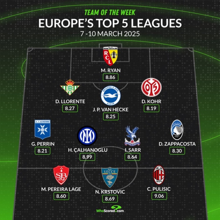 2025-03-12 04:13:04whoscored本周五大聯(lián)賽最佳陣:普利西奇&恰20領(lǐng)銜,袋鼠國門在列