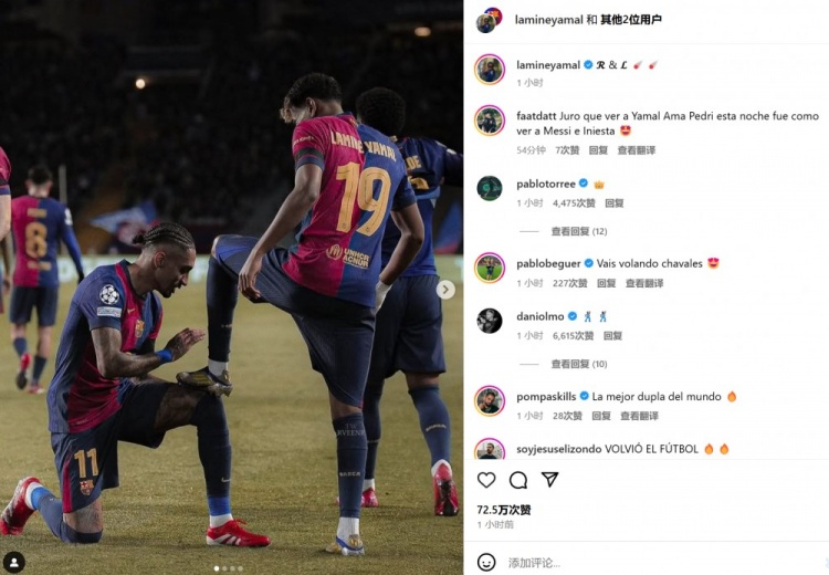 2025-03-12 09:26:43起飛!巴薩兩大邊鋒社媒互動,同時曬出拉菲尼亞為亞馬爾擦鞋照