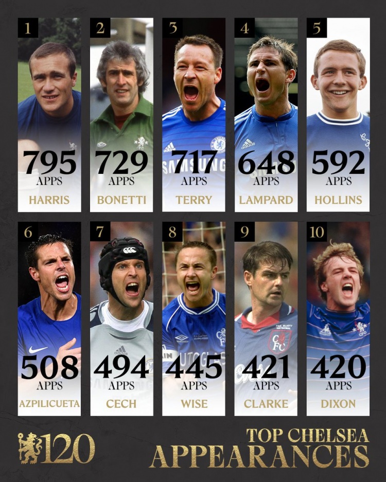 2025-03-12 20:26:19切爾西隊史出場榜:羅恩-哈里斯795場第一,特里第三,蘭帕德第四