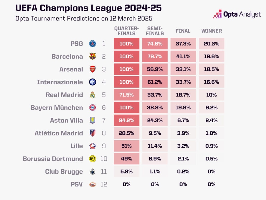 2025-03-12 20:27:54最大熱門出局!opta最新歐冠奪冠概率:巴黎第1 巴薩第2 皇馬第5
