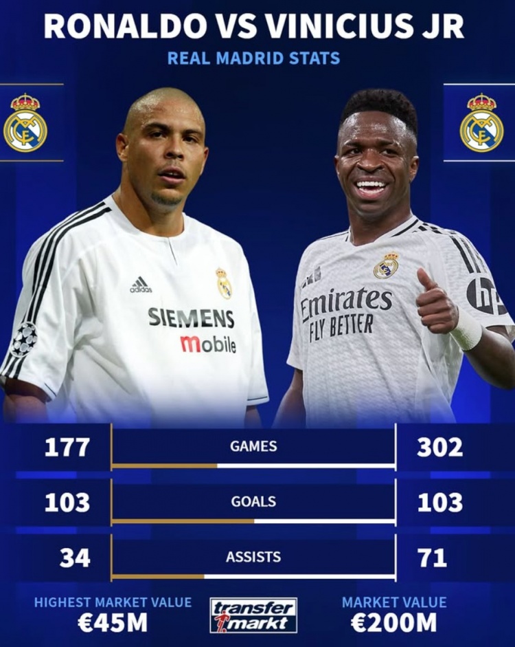 2025-03-13 06:07:21已是傳奇!大羅皇馬生涯177場103球34助,維尼修斯302場103球71助