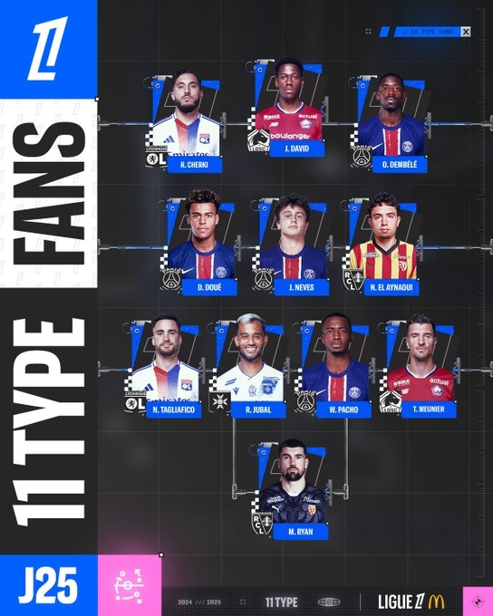 2025-03-13 06:08:37法甲本輪最佳陣:登貝萊領銜,內維斯、杜埃和帕喬入選