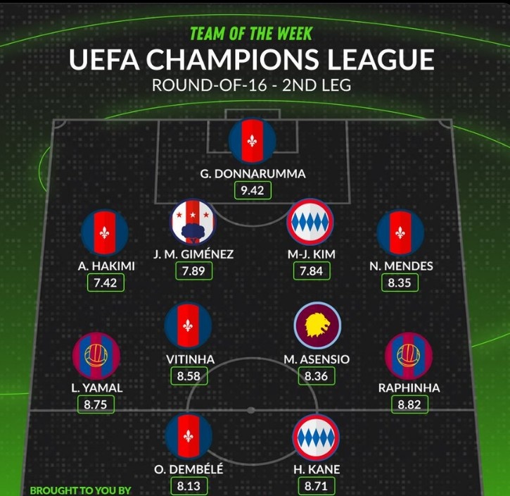 2025-03-13 17:19:46Whoscored評本輪歐冠最佳陣:凱恩領銜,亞馬爾&拉菲尼亞在列